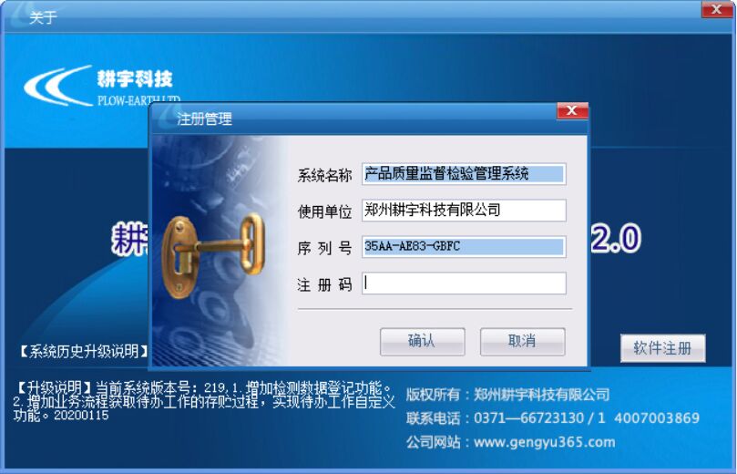 解決方案:我們要用系統(tǒng)管理員的的賬號(hào)(sys)進(jìn)行登錄,然后選擇【幫助】→【關(guān)于本系統(tǒng)】,點(diǎn)擊右下角的【注冊(cè)】,將序列號(hào)發(fā)送到耕宇售后的qq上,然后耕宇售后會(huì)將注冊(cè)碼發(fā)送過(guò)來(lái),復(fù)制粘貼過(guò)來(lái),然后點(diǎn)擊確認(rèn)即可。