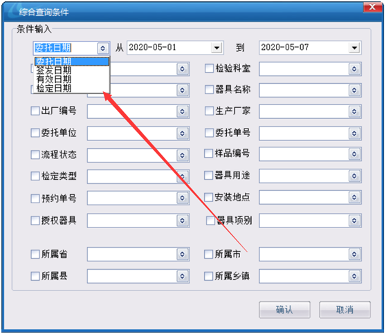 在條件選擇中可根據委托日期,簽發日期,有效日期,檢定日期進行查詢。
