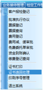 解決方案:【業務接待管理】→【證書追回處理】,點擊菜單欄的條件,然后輸入證書編號,檢索出需要打回的證書,然后將其加入到待處理列表,然后點擊追回按鈕,可選擇將證書追回到客戶報檢登記或者證書編制。